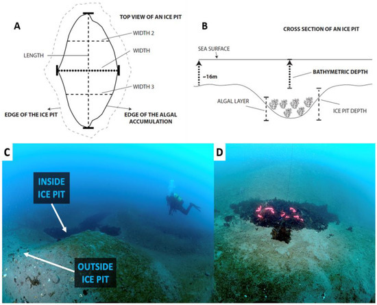 The distribution of ice pits at the study site was mapped in 2018 using 15 transects that were run perpendicular to the coastline of the islet. Transects were 50 m long and 5 m wide, covering in total an area of 3750 m2 that ranged in depth from 12 to 20 m. The center of each pit encountered was used to measure the bathymetric depth and the depth of the ice pit (Figure 3), and a buoy was floated to the surface for georeferencing (GARMIN GPSmap 78s; Garmin Ltd., Olathe, KS, USA; Table 1). The length and width of each pit were measured along the centermost axes, except for ice pits longer than 2 m, where additional width measurements were taken to calculate a mean width (Figure 3). Because the exact demarcation of the edge of the ice pits was often difficult to judge, we used the more distinct edge of the accumulated algal layer within the ice pit for our measurements of length and width. As these measurements were smaller than the physical dimensions of the ice pits, our estimates for ice pit dimensions are thus slightly underestimated (see dashed line in Figure 3A). The thickness of the algal layer was also measured at the center of the pit. From these dimensions, the algal accumulation area (modeled as an ellipse) and algal accumulation volume (modeled as a hemi-ellipsoid) were estimated (Figure 3).