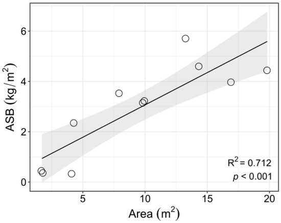 Area-specific biomass of drift algae in ice pits as a function of the ice pit area. Circle-like symbols representing the area-specific biomass of each sampled ice pit. The shaded ribbon spans the 95% confidence interval.