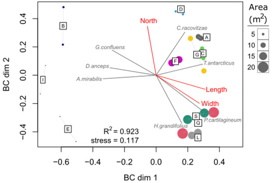 Non-metric multidimensional scaling (nMDS) ordination of the relative biomass of 16 algal species using Bray-Curtis dissimilarity. Each quadrat sample (two for each ice pit) is labeled and colored according to the ice pit and sized relative to the area (m2) of the ice pit. Vectors indicate algal species (gray) and environmental variables (red) with significant fit to the ordination at the p < 0.01 level.