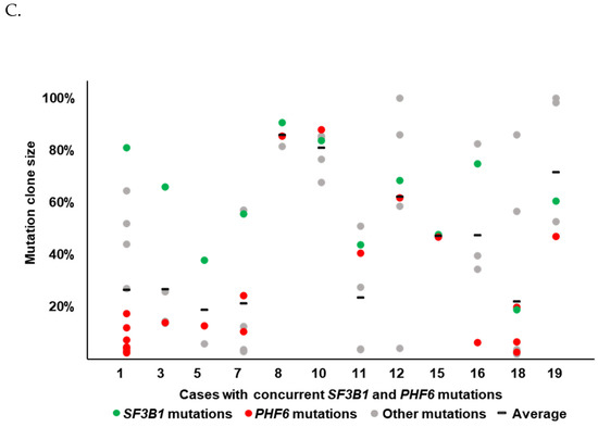 The following supporting information can be downloaded at: https://www.mdpi.com/article/10.3390/biology12010013/s1, Table S1: Variant allele frequency of mutations detected in 21 patients with myeloid neoplasms with SF3B1 and PHF6 mutations during study period.