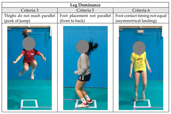 To facilitate understanding and subsequent analysis, in accordance with the aims of the study, the criteria assessed were grouped into categories of modifiable risk factors [31]. The category “leg dominance”, which refers to the concept of asymmetry, defined as an imbalance between the two lower limbs in regards to strength, coordination and motor control [6], comprised criteria (3) thighs not equal side to side during flight, (5) foot placement not parallel (front to back) and (6) foot contact timing not equal (asymmetric landing) (Figure 1).