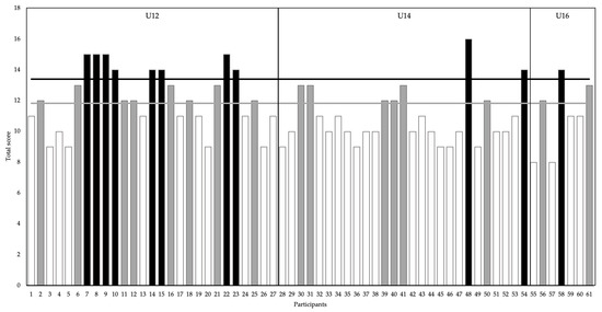 In the original version of the TJA [19], the 10 criteria are assessed in a dichotomous manner and it is suggested that a total score above six should be the threshold to identify female players with a greater risk of injury and, therefore, the target of specific prevention training. In the present study, in which the modified version of the TJA was used [6], the participants with the highest scores in relation to the mean were identified by classifying them into two groups using the z-score calculation [23,36]. Eleven players out of the total obtained scores from “high to extreme” (z ≥ 1) and fifteen players obtained scores from “small to moderate” (z = 0.20 to 0.99) (Figure 2). The majority of the players with scores from “high to extreme” (8/11) and from “small to moderate” (8/15) were in the U12 category (Figure 2). The use and interpretation of the z-score allow identification of the players whose injury prevention strategies should be optimised [38] since, as demonstrated, the maturation phase and the chronological age of the female players can influence the jump landing performance [7].