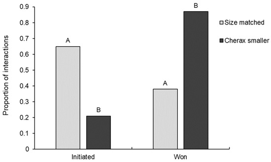 The proportion of interspecific interactions initiated and won by Euastacus dharawalus in interactions where Cherax destructor was the smaller opponent and interactions where opponents were size matched (size difference of <10%). Different letters denote significant differences based on Tukey’s post hoc tests. “Cherax larger” was only observed on one occasion so has not been displayed here.