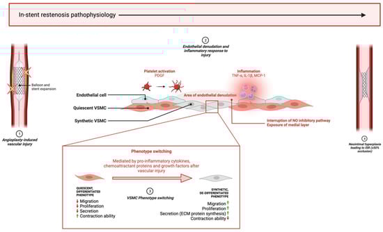 The pathophysiology of ISR is multifactorial and involves distinct and overlapping cellular and molecular mechanisms across different vascular cell types (Figure 1). After vascular injury, the pathophysiology of ISR can be subdivided into early, intermediate, and late phases. During the early phase, endothelial denudation occurs following direct mechanical injury, causing the destruction of the intimal endothelial cell layer, followed by inflammation, platelet activation, growth factor and pro-inflammatory cytokine release. In the intermediate and late phases, vascular smooth muscle cells (VSMC) cause neointimal hyperplasia (NIH), a process mediated by phenotype switching caused by inflammation, resulting in the formation of restenosis [,,].