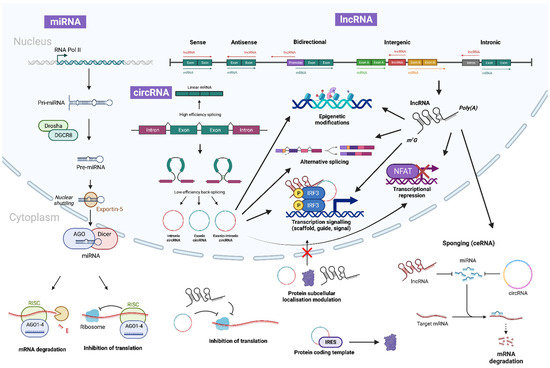 Noncoding RNAs (ncRNAs) are conventionally described as a class of RNA that is transcribed from the genome but not translated further into a functional peptide. However, recent studies have observed the presence of small open reading frames on some ncRNAs that result in peptide translation []. The ENCODE project [] has revealed that 80% of the human genome is transcribed into RNA, of which only approximately 2% corresponds to protein-coding regions []. Contrary to previous beliefs, ncRNAs have been increasingly associated with essential biological processes and signalling pathways, with key implications in regulating gene expression and pathogenesis. The main types of regulatory ncRNAs are microRNA (miRNA), long-noncoding RNA (lncRNA), and circularRNA (circRNA) (Figure 2).