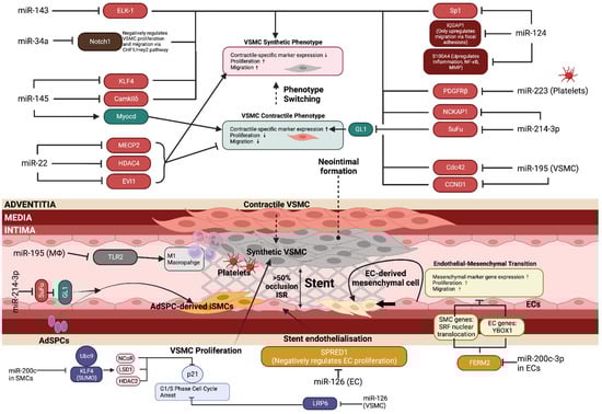 Numerous miRNAs induce epigenetic modifications and regulate mRNA expression levels, affecting signalling pathways specific to vascular cell functions and NIH during restenosis pathophysiology (Table 1 and Figure 3). Most VSMC-specific contractile marker genes (α-SMA, SMMHC, SM22α, calponin, transgelin), and genes important for proliferation, migration, and apoptosis, contain an evolutionarily conserved CArG box (CC(A/T)6GG) in the promoter region []. The CArG box and its regulation are the convergence point for many other signalling pathways, under the control of key transcription factors, such as serum response factor (SRF) paired with its muscle-specific co-activator Myocardin (Myocd) []. Myocd binds SRF to form an SRF–Myocd ternary complex, which binds to the promoter regions of contractile-specific genes to allow for the transcription and expression of the quiescent, contractile VSMC phenotype []. Due to the plastic nature of VSMCs, the phenotype switch to the synthetic state observed in restenosis is dependent on the balance between additional co-repressors, co-activators, and environmental factors. miRNAs are implicated in regulating a large proportion of these signalling pathways and gene targets. Specifically, Krüppel-like factor 4 (KLF4) is often implicated in cardiovascular pathophysiology [], as an important regulator of VSMC phenotype switching and a target for many miRNAs. KLF4 expression counteracts Myocd and promotes the synthetic VSMC phenotype by preventing SRF association with the contractile-specific gene promoter regions. Moreover, histone deacetylase 2 (HDAC2), which is regulated by miRNAs, causes this transcriptional repression through chromatin condensation and compaction, which blocks CArG site accessibility to SRF [,]. PDGF increases the expression of KLF4, while disrupting the SRF–Myocd complex via the phosphorylation and nuclear import of Elk-1, causing Myocd displacement from SRF–Myocd ternary complex and forming an Elk-1–SRF ternary complex that blocks contractile-specific gene expression at the locus []. Apart from controlling VSMC functions, emerging evidence also suggests a functional role for miRNAs in EC biology and re-endothelialisation, which provides opportunities for the therapeutic inhibition of ISR while promoting re-endothelialisation after stent implement.