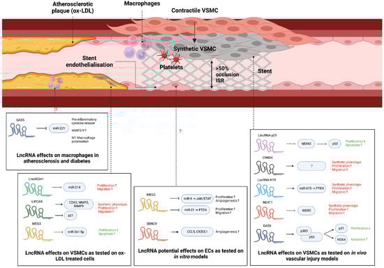 lncRNAs in vascular cell biology and ISR. lncRNAs are increasingly being associated with regulating key processes behind restenosis. Specifically, handful of lncRNAs (e.g., lincRNA-p21, CRNDE, H19, NEAT1, GAS5) have been reported to play a role in VSMC functions and ISR formation, while two lncRNAs (MEG3 and SENCR) regulate EC function and possibly stent endothelialisation. Additionally, multiple lncRNAs were found to regulate OX-LDL-induced VSMC proliferation, migration and apoptosis (linc00341, LIPCAR, MEG3) and macrophage polarisation (GAS5), implying a role in atherosclerosis development. ‘↑’ and ‘↓’, indicate ‘increase’ and ‘decrease’, respectively. This diagram was created with Biorender.com.