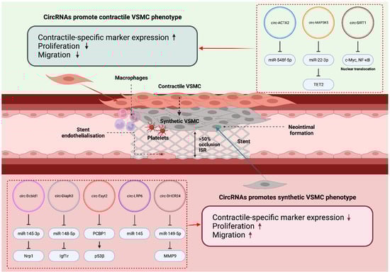 circRNAs in vascular cell biology and ISR. A handful of circRNAs were reported to modulate VSMC phenotype switching, thereby promoting or inhibiting ISR formation. ‘↑’ and ‘↓’, indicate ‘increase’ and ‘decrease’, respectively. This diagram was created with Biorender.com.