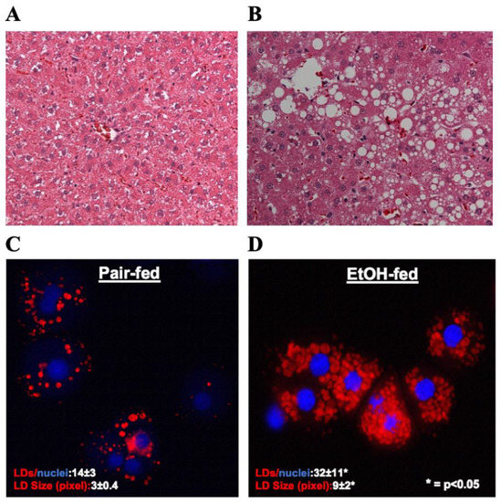 Alcoholic liver disease (ALD) is a leading cause of mortality worldwide [1,2,3]. The world health organization (WHO) reports 3 million deaths every year from ALD, which represents 5.3% of all deaths [1]. ALD is actually a spectrum of disease states that ranges from asymptomatic stages to alcoholic fatty liver, and finally to complete liver failure [4]. An early manifestation of ALD is the development of hepatic steatosis or a fatty liver that can be reversed by alcohol abstinence [5,6]. However, a continuous consumption of alcohol can progress to alcoholic hepatitis, cirrhosis, and eventually death [4,7]. Thus, there is a critical need to understand the molecular mechanism of ALD in order to diagnose the disease at its earliest stages (i.e., steatosis) to prevent progression to the later stages and a fatal outcome.