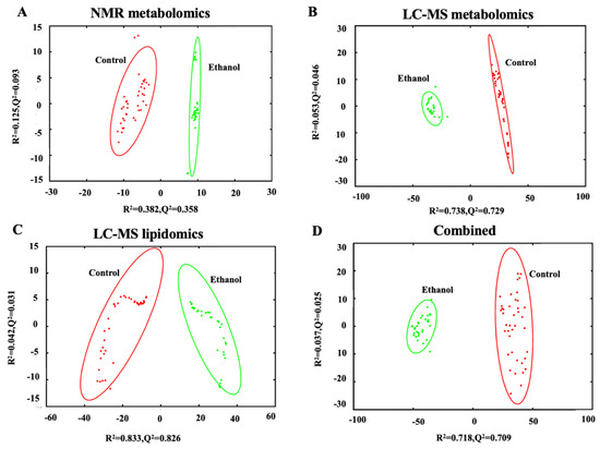 All four PCA scores plots exhibited similar and significant differences between the control and EtOH-fed groups with high statistical quality metrics as indicated by average R2 and Q2 > 0.7 ± 0.2. The PCA model using the NMR dataset had the lowest quality metrics while the LC-MS lipidomics dataset had the best metrics. Overall, the Q2 metrics indicate that the PCA is a consistent model with a good fit to the data and a reliable indicator of a group separation. The R2 and Q2 values for each of the four individual PCA models are listed in Supplemental Table S1.