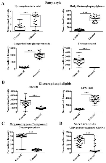 Representative box plots are shown in Figure 3, which clearly indicates the statistically significant increase or decrease in metabolite concentrations that resulted from EtOH feeding. For example, EtOH increased hydroxy isovaleric acid, methyl-butenoyl-apiosylglucose, and gingerdiol-beta-glucopyranoside, which are in the fatty acyl glycosides or fatty acids and conjugates subclasses of the fatty acyls class (Figure 3A). The two remaining fatty acyls, tricosenoic acid and dimethylnonanoyl carnitine, decreased following EtOH feeding and belong to two different subclasses, unsaturated fatty acids, and fatty acid esters, respectively. Two other metabolites, PI (36:4) and LysoPA (18:3), belong to the glycerophospholipids class. EtOH feeding decreased PI (36:4), but increased LysoPA (18:3) (Figure 3B). Glucose-1-phosphate belongs to the organooxygen compound class and was downregulated after alcohol feeding. The last two VIP metabolites, riboflavin, and UDP-O-beta hydroxymyristoyl-GlcNac, were assigned to the pteridines and derivatives, and saccharolipids classes, respectively. EtOH feeding increased riboflavin but decreased UDP-O-beta hydroxymyristoyl-GlcNac (Figure 3C,D).