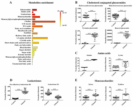 A few select representative box plots for metabolites altered by EtOH administration are shown in Figure 4B–E. Again, it is clear from these box plots that EtOH feeding induced a statistically significant increase or decrease in the concentration of a specific set of metabolites. For example, EtOH administration decreased sterol-conjugated glucuronides such as hydroxy androsterone-glucuronide and dehydrotestosterone-glucuronide and increased other glucuronides such as tyramine-glucuronide and benzoyl glucuronide (Figure 4B). EtOH feeding also led to an increase in several amino acids like alanine and lysine (Figure 4C). For leukotrienes, EtOH induced an increase in oxo-dihydroxy-leukotriene B4, but it led to a decrease in leukotriene E4 (Figure 4D). Among the monosaccharides, xylose and xylulose were both increased upon EtOH administration (Figure 4E). While fatty acyl glycosides and fatty acyl carnitines (i.e., subclasses of fatty acyl) were still identified by the enrichment analysis, they were not a top choice in the absence of the lipidomics dataset due to the limited number of metabolites observed as a hit (Supplemental Table S2).
