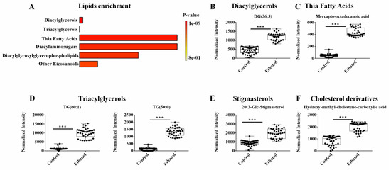 (A) An enrichment analysis of the 39 lipids from the LC-MS lipidomics data set with a statistically significant change in hepatocyte cells following ethanol exposure. (B–F) Representative box plots of lipids from the top enriched pathways in (A) that highlight the top lipid changes in the lipidomics data sets. All the metabolites demonstrated a fold change > 2.0 and an FDR p-value < 0.001 using the Benjamini-Hochberg method. Compound class and names are listed above the box plots. *** p-value < 0.001.