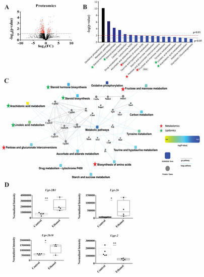 (A) A volcano plot summarizing the LC-MS proteomics data set. The dashed line identifies the p-value of 0.05. All proteins above the p-value threshold are colored red. A total of 2083 proteins were detected with 368 proteins differentially expressed (p-value < 0.05). (B) A protein enrichment analysis based on the 124 differentially expressed proteins showing the most impactful 17 Kyoto Encyclopedia of Genes and Genomes (KEGG) pathways. The pathways common to both the metabolomics and proteomics data sets or both the lipidomics and proteomics data sets are marked with red and green stars, respectively. (C) A Cytoscape generated protein–protein interaction (PPI) network of the significantly changing (p-value < 0.05) KEGG pathways. The pathways common to both the metabolomics and proteomics data sets or both the lipidomics and proteomics data sets are marked with red and green stars, respectively. (D) Box plots of the UDP-glucuronosyltransferases (UGTs) proteins that are part of the glucuronidation pathway. * p-value < 0.05, ** p-value < 0.01.