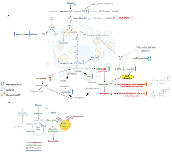 A metabolomics and lipid network map (Figure 7A) was created by manually curating the statistically significant metabolites (MS, red; NMR, blue) and lipids (green) with an observed enrichment analysis (FDR-corrected p < 0.05) and adding them to a standard set of metabolic pathways that was then plotted with the Biorender application [47]. Metabolites and lipids that were increased due to ethanol treatment are shown as up arrows. Metabolites and lipids that were decreased due to ethanol treatment are shown as a down arrow. The network map was constructed sequentially by first starting with glucuronides, the most enriched subclass of metabolites, which were then followed by DAGs and TAGs, the most enriched subclass of lipids. The metabolic pathways upstream or downstream of these enriched metabolites and lipids were then added sequentially to the network map. For example, the TCA cycle is upstream from both triglycerides and glucuronides and TCA cycle intermediates, citrate, and succinate (FC > 3.0, FDR-corrected p < 0.001, VIP > 1.0), were also identified in the enrichment analysis. Thus, the TCA cycle along with glycolysis and gluconeogenesis were added to the network map. Similarly, pyruvate, which is the end-product of the glycolysis pathway and feeds into the TCA cycle and fatty acids pathways, was also added to the network map. Pyruvate was significantly increased in ethanol treated hepatocytes (FC > 2.79, FDR-corrected p < 0.001, VIP = 0.85). Other metabolites and lipids were added to the network map in a similar manner.