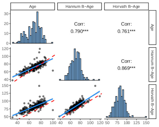 Correlation between biological age estimations and chronological age. Lower and upper panels represent the correlation between biological age estimations (Hannum and Horvath formulas) and chronological age.The red-dashed lines in the lower panels represent the “perfect” concordance between variables, while the blue straight lines correspond to the true association obtained from a linear fit. Diagonal panels show the histograms from each variable. *** p-value < 0.001.