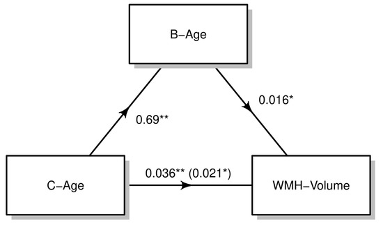Causal mediation analysis. After bootstrap resampling, C-age showed a significant effect on B-age (β = 0.7), which was subsequently related to WMH-volume (β = 0.016). Mediation analysis revealed a significant partial mediation on the effect of C-age on WMH via B-age (β-coefficient reduction from 0.036 to 0.021). These effects are adjusted for those variables that entered in the forward stepwise regression model (see Table 3). * p-value < 0.05; ** p-value < 0.01.