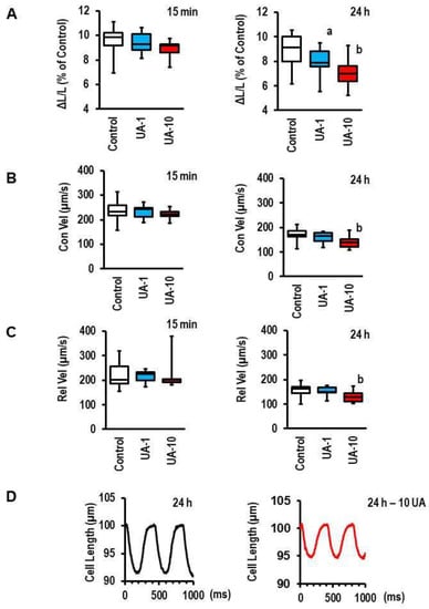 Effect of uric acid (UA) on cell shortening of cardiomyocytes. Cells were treated with UA for 15 min or 24 h, as indicated. Concentrations used were 1 mg/dL (UA-1) or 10 mg/dL (UA-10). Data show results for relative cell shortening (shortening amplitude [ΔL] normalized to diastolic cell length [L] and expressed as percent cell shortening (A), contraction velocity (Con-Vel, (B)) expressed in µm per s, and relaxation velocity (Rel-Vel, (C)) expressed in µm per s. Representative single-cell recordings for 24 h UA exposure (10 mg/dL) are given in (D). Data are means from n = 11 (control, 10 min), n = 10 (UA-1, 10 min), n = 6 (UA-10, 10 min), n = 24 (control, 24 h), n = 13 (UA-1, 24 h), and n = 22 (UA-10, 24 h) preparations (rats), with 4 cell culture dishes per preparation and 9 cells evaluated per cell-culture dish. Statistical analysis is based on preparations. Data are expressed as bars and whiskers with median, 25% quartile, 75% quartile indicated by bars, and complete range by whiskers. Statistical analysis is based on one-way ANOVA and Student–Newman–Keuls post hoc analysis. a, p < 0.05 vs. control and UA-10; b, p < 0.05 vs. control and UA-1.