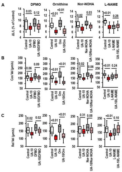Effect of difluoromethyl ornithine (DFMO), ornithine (Orn), Nω-Hydoxy-l-arginine-acetate (Nor-NOHA), or L-NG-Nitro arginine methyl ester (L-NAME) on cell shortening and uric-acid (UA)-dependent effects. Data show the effects on cell shortening ((A); ΔL/L), contraction velocity ((B); Con Vel), and relaxation velocity ((C); Rel-Vel). Data are expressed as bars and whiskers with median, 25% quartile, 75% quartile indicated by bars, and complete range by whiskers. Statistical analysis is based on Student t-tests and exact p-values are indicated. Data are means from n = 10 (each) preparations (rats), with 4 cell culture dish per preparation and 9 cells evaluated per cell-culture dish. Statistical analysis is based on preparations. Two-way ANOVA was performed to exclude an interaction between the UA effects and that of the inhibitors.