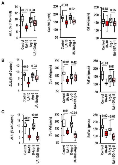 Effect of arginine supplementation on cell shortening and uric-acid (UA)-induced effects. Cells were exposed to L-arginine (Arg-1; 1 µmol/L; Arg-5, 5 µmol/L) or D-arginine (D-Arg, 5 µmol/L) and UA-10 (10 mg/dL). Data show the effects on cell shortening ((A); ΔL/L), contraction velocity ((B); Con Vel), and relaxation velocity ((C); Rel-Vel). Data are expressed as bars and whiskers with median, 25% quartile, 75% quartile indicated by bars, and complete range by whiskers. Statistical analysis is based on Student t-tests and exact p-values are indicated. Data are means from n = 10 (each) preparations (rats), with 4 cell culture dish per preparation and 9 cells evaluated per cell culture dish. Statistical analysis is based on preparations.