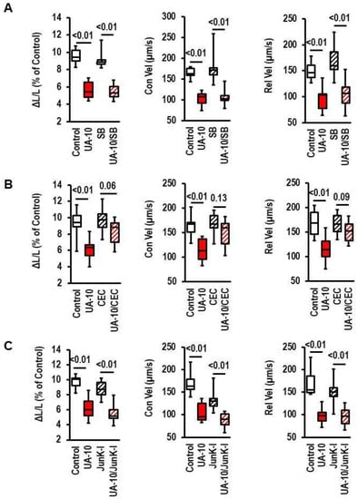 Effect of inhibition of signal transduction pathways on cell shortening and uric-acid (UA)-induced effects. Cells were exposed to SB202190 (SB; 10 µmol/L), chelerythrine chloride (CEC, 10 µmol/L), or SP600125 (SP, 10 µmol/L) and UA-10 (10 mg/dL). Data show the effects on cell shortening ((A); ΔL/L), contraction velocity ((B); Con Vel), and relaxation velocity ((C); Rel-Vel). Data are expressed as bars and whiskers with median, 25% quartile, 75% quartile indicated by bars, and complete range by whiskers. Statistical analysis is based on Student t-tests and exact p-values are indicated. Data are means from n = 10 (each) preparations (rats), with 4 cell culture dish per preparation and 9 cells evaluated per cell culture dish. Statistical analysis is based on preparations.