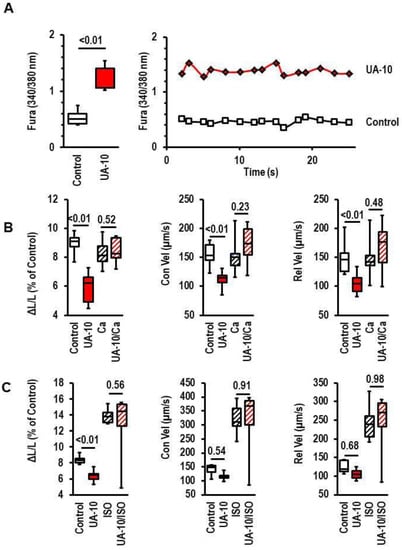 Reduction in contractility may depend on two different mechanisms that have been reported before. First, the reduced mobilization of calcium from intracellular stores (i.e., sarcoplasmatic reticulum) or, second, the impairment of the calcium sensitivity of troponin subunits. In the first case, calcium transients are decreased, whereas, in the second case, they are normal or even enhanced. To clarify which mechanism may be involved in the UA-dependent effect, we analyzed calcium amplitudes during contraction. As shown in Figure 6A, calcium transients were even improved in the presence of UA despite the attenuating effect on cell shortening. This suggests that the calcium affinity of troponin subunits is altered. If this assumption is correct, the effect of UA should be alleviated by increasing the extracellular calcium concentration or the increased mobilization of intracellular calcium stores via the stimulation of β-adrenoceptors. We tested both possibilities and found that increasing extracellular calcium from 1.25 mmol/L to 1.75 mmol/L completely attenuated the deteriorative effect of UA and the β-agonist isoproterenol mostly attenuated the effect of UA (Figure 6B,C).