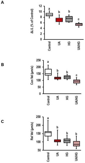Effect of hyperglycemia on uric-acid (UA)-induced effects on cell shortening. Cells were exposed to UA (3 mg/dL) and glucose (15 mmol/L; HG) for 24 h before analyzing cell shortening. Data show the effects on cell shortening ((A); ΔL/L), contraction velocity ((B); Con Vel), and relaxation velocity ((C); Rel-Vel). Data are expressed as bars and whiskers with median, 25% quartile, 75% quartile indicated by bars, and complete range by whiskers. Statistical analysis is based on Student t-tests and exact p-values are indicated. Data are means from n = 10 (each) preparations (rats), with 4 cell culture dish per preparation and 9 cells evaluated per cell culture dish. Statistical analysis is based on preparations. Equal letters (a, b) indicate sample groups with p > 0.05. Different letters indicate p < 0.05.