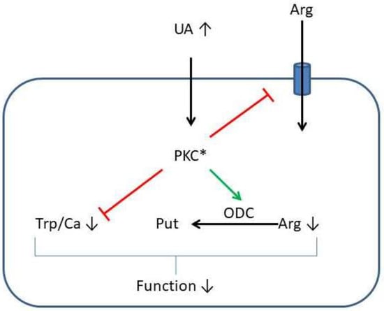 We also observed that the effect of UA depends on the activity of the PKC. Interestingly, it was described in other cells that PKC can inhibit the main arginase transport protein in myocytes, CAT-1 [37]. In contrast, the inhibition of other protein kinase signal pathways, such as p38 MAP kinase and c-Jun-kinase, both known to trigger cardiac dysfunction in other contexts, does not modify the responsiveness of the cells to UA. Furthermore, PKC activity is required for ODC induction [38]. UA induces the protein expression of ODC in cardiomyocytes as well. Therefore, UA may trigger various PKC-dependent effects that reduce cell function.