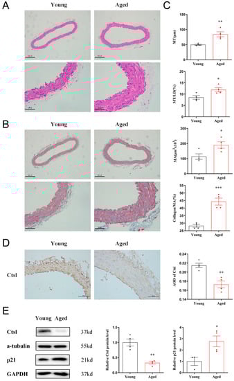 To investigate the relationship between Ctsl and vascular aging, we separated the thoracic aortas of 18-month-old and 8-week-old mice. A significant increase of MT, MT/LD, MA, and collagen/MA was observed in the aortas of aged mice by histological analyses (Figure 1A–C), indicating the presence of vascular remodeling. The expression of Ctsl in young and senescent aortas was analyzed by IHC and WB subsequently. As shown in Figure 1D,E, Ctsl significantly decreased in senescent aortas, with increased expression of p21. Therefore, we may speculate that Ctsl participates in the procedure of the vascular aging.