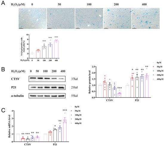 Since ECs senescence has been recognized as a primary process of vascular aging, we explored the connections between CTSV and endothelial cell senescence in vitro. H2O2 was widely used as stimulation of inducing cell senescence; therefore, in our study, HUVECs were treated with different dose of H2O2 (0 μM, 50 μM, 100 μM, 200 μM, and 400 μM) for 24 h to induce cellular senescence. With the raised concentration of H2O2 increased, SA-β-gal positive cells accordingly increased, as well as the expression of P21 and P16, indicating the presence of senescence. Meanwhile, CTSV significantly decreased after treated with 400 μM H2O2 (Figure 2A,C and Figure S1A,B), thus the concentration of 400 μM H2O2 was adapted for further study. However, the expression of P53 remained unchanged at both mRNA and protein level, indicating that P53 was not involved in H2O2-induced cellular senescence, which was consistent with previous studies [29]. These findings demonstrated that CTSV decreases with cellular senescence in vitro.