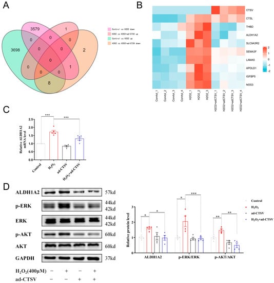 In addition, the mRNA expression of the recognized 8 genes was confirmed by RT-PCR and 5 of which showed the same tendency as RNA sequencing, including ALDH1A2, IGFBP5, NOS3, THBD, and SEMA3F (Figure 4C and Figure S2). Since the role of ALDH1A2 and SEMA3F has not been widely studied in cellular senescence [30,31,32], we further analyzed the protein level of ALDH1A2 and SEMA3F by WB. As shown in Figure 4D and Figure S3, the protein expression of SEMA3F was basically unchanged, while ALDH1A2 was significantly increased in H2O2 group and decreased after over-expression of CTSV. Therefore, ALDH1A2 may be a novel mediator of cellular senescence. It was reported that ALDH1A2 mainly acts as an enzyme that catalyzes the synthesis of retinoic acid (RA) from retinaldehyde, while RA can upregulate the expression of p21 via ERK1/2 and AKT pathways [33,34]. We analyzed the expression and phosphorylation of ERK1/2 and AKT subsequently and found that ad-CTSV reduced the increase of ERK1/2 and AKT phosphorylation induced by H2O2.