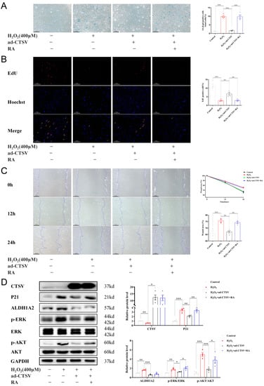 To verify whether CTSV attenuates cellular senescence by ALDH1A2, exogenous RA was added to HUVECs. RA reversed the anti-senescence effect of CTSV in H2O2 treated cells, as shown by increased SA-β-gal positive cells and impaired cell proliferation and migration (Figure 5A–C). Additionally, RA did not affect the expression of CTSV and ALDH1A2 but reversed the effect of ad-CTSV on P21, p-ERK1/2, and p-AKT (Figure 5D).