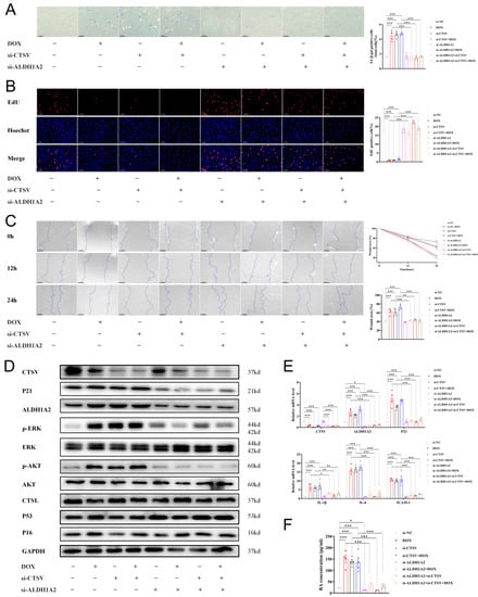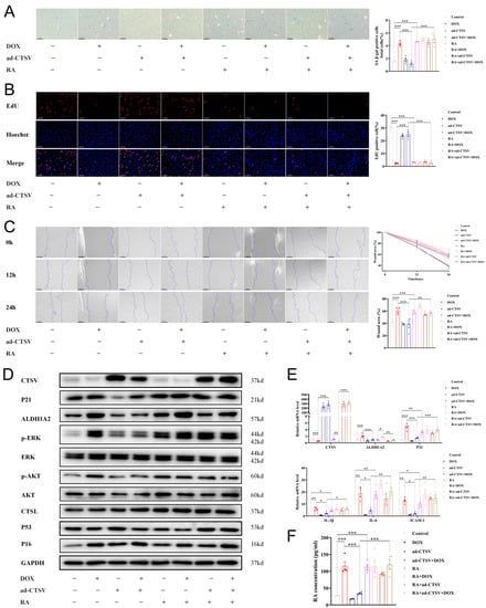 To further confirm the effect of CTSV in cellular senescence, a doxorubicin (DOX)-induced senescence model was used. Administration of DOX induced cellular senescence and impaired cell proliferation and migration. Simultaneously, it downregulated CTSV expression and upregulated ALDH1A2, RA, p-AKT, p-ERK1/2, and P21. Ad-CTSV reversed the effect of DOX, while further administration of RA canceled the function of ad-CTSV. However, ad-CTSV or RA did not affect the expression of P16 increased by DOX. Moreover, DOX, ad-CTSV, and RA had little influence on the expression of CTSL and P53 (Figure 6, Figures S1E and S4A).