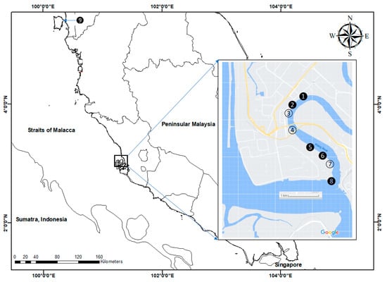The sediment samplings were conducted in the estuary section of the Klang River with the mangrove ecosystem (S1–S8) on 2 December 2007, while sediment samplings from the site at Juru mangrove (S9) were collected on 8 December 2007, as can be seen in Figure 1 (Table S1). The sampling site at Juru (S9) was selected because it was the previously reported known polluted site []. Hence, it is important for reference purposes. In all of the sampling sites (S1–S9), three subsamples of surface sediments in the mangrove area were collected using a clean plastic scoop. However, the leaves of mangrove Avicennia were hand-collected at 6 sites (S1, S2, S5, S6, S8 and S9) (Figure 1). At every sampling site, 20 old leaves from three different trees of Avicennia were collected. Upon collection, the samples were transferred to the laboratory in zipped-lock polyethylene bags.
