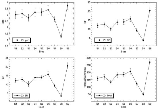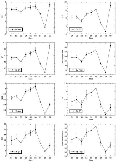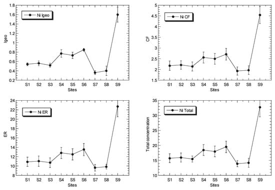 The overall values of Igeo, CF, and ER for Cu, Ni, Pb and Zn, in the surface sediments from the Klang River estuary and the site in the Juru estuary, based on the background levels of the metals as reference a metal or normalizer that were reported from Peninsular Malaysia, are presented in Table 2 (Table S6), and the mean values are presented in Figure 2.