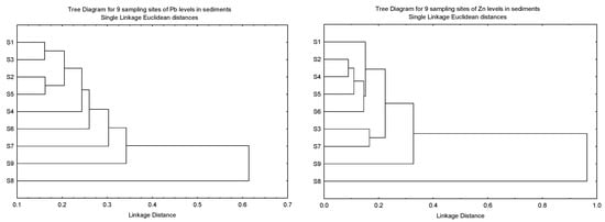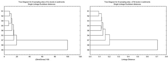 The clustering patterns of the nine sampling sites of Cu, Ni, Pb and Zn in the sediments based on Igeo, CF, and ER, and the geochemical fractions of the sediments, are given in Figure 3. It was found that S8 was clustered as a single major entity from the other subclusters for Cu, Pb and Zn due to the levels of the three metals being significantly lower than the other eight sites. However, the significantly higher levels of Ni in S9 resulted in S8 being clustered as a major entity. Although the highest levels of Cu and Zn were found in S9, this site was not significantly higher than the other sites.