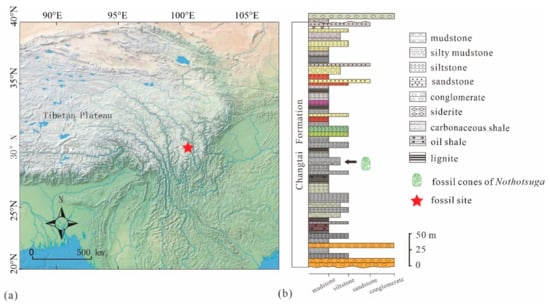 The well-preserved fossil seed cones of Nothotsuga were found in the Mula Basin, in the Ganzi Autonomous Prefecture, eastern Sichuan Province, southwestern China (Figure 1a). The Mula Basin is an intermountain basin, or a graben basin, and is located in the southern Yidun Terrane. Furthermore, it is a flexural basin that formed in an alluvial environment and developed in a far-field, upper-crustal response to the plateau outgrowth. This plateau outgrowth resulted from the India–Asia collision, which occurred prior to the onset of the dominant strike-slip deformation throughout the eastern TP []. Based on the U-Pb zircon geochronology and thermochronology results, this is considered an Oligocene age for the development of the Mula Basin [,].