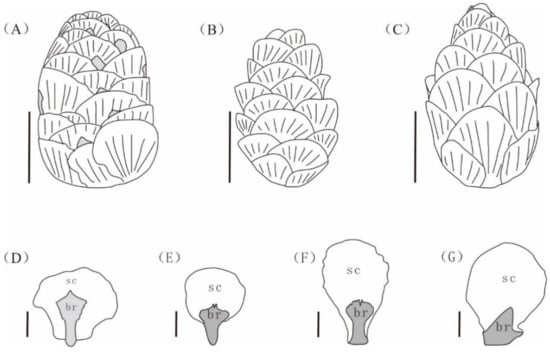 The line drawing of seed cones and bract-scale complexes of Nothotsuga mulaensis and extant Tsuga. br = bract, sc = scale. (A) Seed cone of N. mulaensis. (B) Seed cone of T. chinensis. (C) Seed cone of T. dumosa. (D) Scale-bract complexes of N. mulaensis. (E) Scale-bract complexes of T. chinensis. (F,G) Scale-bract complexes of T. dumosa. (A–C) Scale bar = 10 mm; (D–G) Scale bar = 5 mm.