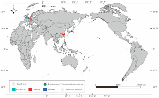 The spatial distribution map of fossil records and modern species of Nothotsuga [,,,].
