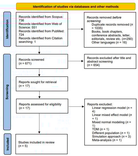 Out of 2011 articles identified, 736, 551, and 724 were from Scopus, Web of Science, and PubMed databases, respectively. An additional article was identified through the manual search process. A total of 1035 duplicate articles were removed. After title and abstract screening, 654 articles were removed, and 17 were available as full-text articles. Out of 17 articles, 12 were excluded for the following reasons: (i) a linear regression model for pharmacogenetic analysis (n = 4); (ii) a linear mixed effect model (n = 1); (iii) a mixed normal model (n = 1); (iv) a TDM study (n = 1); (v) the patient population of the study was not with breast cancer (n = 1); (vi) meta-analysis (n = 1); (vii) only simulation was carried out (n = 3). There were five articles that remained for the systematic review. Figure 1 presents the PRISMA flow diagram describing the selection of the PopPK tamoxifen studies for the systematic review.