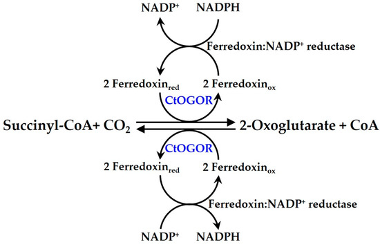 Chorobaculum tepidum is a photosynthetic bacterium that possesses a reductive TCA (rTCA) cycle for carbon fixation [1,2]. Among the carbon-fixing enzymes responsible for critical steps of the rTCA cycle, it possesses 2-oxoglutarate:ferredoxin oxidoreductase (OGOR, also known as KGOR or KFOR), which is classified under the 2-oxoacid:ferredoxin oxidoreductase (OFOR) superfamily. It catalyzes the bidirectional carboxylation/decarboxylation reaction between succinyl-CoA and 2-oxoglutarate (Figure 1). OGORs from diverse species have been previously studied [3,4,5,6,7,8]. OGORs commonly contain the [4Fe-4S] cluster and thiamine pyrophosphate (TPP), although the number of each cofactor varies [3,4,5,6,7,8]. Due to the (4Fe-4S) cluster, the OFOR superfamily of enzymes is generally vulnerable to oxygen exposure [9]. OGOR from C. tepidum (CtOGOR) consists of a large subunit (CtOGOR-A, α-subunit, KorA) and small subunit (CtOGOR-B, β-subunit, KorB) [1].
