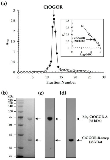 CtOGOR is composed of two subunits, CtOGOR-A (α-subunit) and CtOGOR-B (β-subunit). The ORFs of korA and korB, coding for CtOGOR-A and CtOGOR-B, respectively are clustered around a 3-bp gap in the genome of C. tepidum, which implies that both genes are co-expressed at the transcriptional level as well as the tight interaction of gene products. As expected, after purification using His-tag affinity chromatography and subsequent gel-filtration chromatography, a single peak was detected in the chromatogram, which corresponded to a molecular mass of 220 kDa (Figure 2a). When the peak was pooled and subjected to SDS-PAGE, two bands were observed (Figure 2b and Figure S1a), illustrating the expected size of both subunits of CtOGOR at similar densities. These were confirmed to be His6-CtOGOR-A (N-terminally His6-tagged CtOGOR-A) and CtOGOR-B-strep (C-terminally strep-tagged CtOGOR-B) by Western blotting experiments