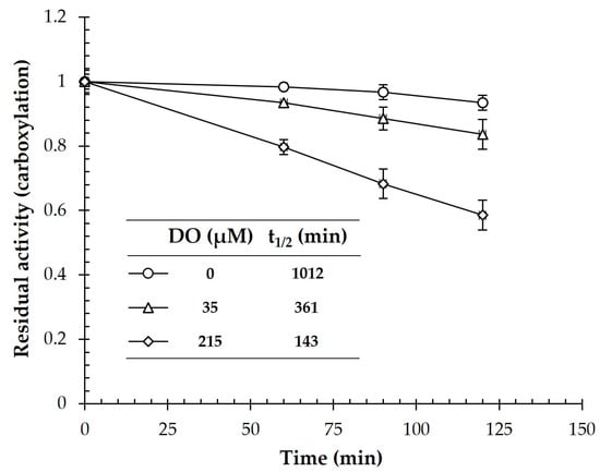 Synechocystis performs oxygenic photosynthesis. Thus, molecular oxygen is produced by the light reaction of photosynthesis, and the Fe-S cluster of CtOGOR may be detrimentally affected. Enzymes in the OFOR superfamily are sensitive to O2 [9]. Accordingly, we assessed the stability of the carboxylation activity of CtOGOR under anaerobic (0% O2: DO, 0 μM), semi-aerobic (2% O2: DO, 35 ± 5 μM), and aerobic (21% O2: DO, 215 ± 7 μM) conditions (Figure 3). The residual activity decreased further as the DO level increased. Nonetheless, CtOGOR maintained its activity with a half-life of 143 min under aerobic conditions. Moreover, the half-life was extended to 361 min under semi-aerobic conditions, which may correspond to the O2 environments in Synechocystis cells [24].