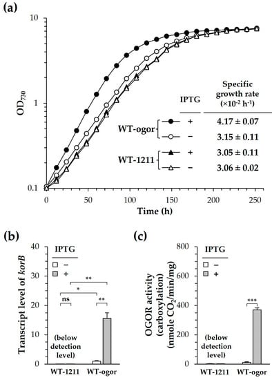 Photoautotrophic growth of Synechocystis producing heterologous 2-oxoglutarate:ferredoxin oxidoreductase (CtOGOR). The photoautotrophic growth of WT-ogor (circle) and WT-1211 (triangle) were recorded in the presence (closed symbols) and absence (open symbols) of 1 mM IPTG (a). Specific growth rates were determined at exponential phases. Transcript levels of korB (b) at exponential phase was determined by RT-qPCR using 16S rRNA as a reference gene. The cellular activity of CtOGOR (c) was determined and normalized by protein level (mg). Significances were assessed by Student’s t-test: ns, p > 0.05; *, p ≤ 0.05; **, p ≤ 0.01; ***, p ≤ 0.001 (n = 3).
