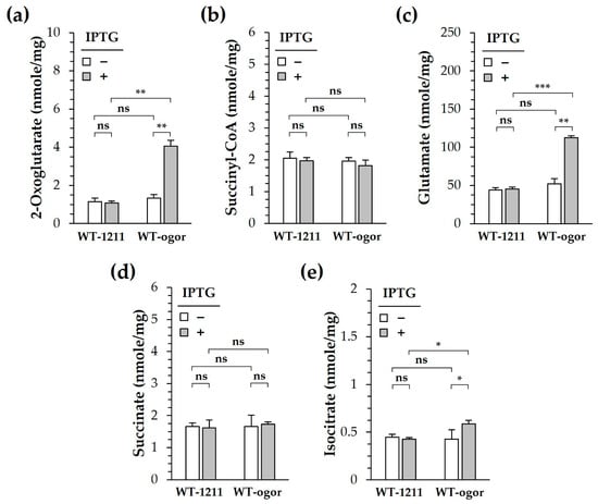 Cellular metabolite levels of Synechocystis producing 2-oxoglutarate:ferredoxin oxidoreductase (CtOGOR). WT-ogor and WT-1211 were grown photoautotrophically in the presence and absence of 1 mM IPTG. Cells were harvested at the exponential phase for metabolite analysis. The cellular level of 2-oxoglutarate (a), succinyl-CoA (b), glutamate (c), succinate (d) and isocitrate (e) were determined and normalized by total protein contents in the cells (mg). Significances were assessed by Student’s t-test: ns, p > 0.05; *, p ≤ 0.05; **, p ≤ 0.01; ***, p ≤ 0.001 (n = 3).