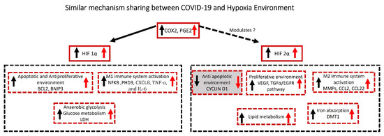 Similarly, activation of COX2 and HIF-1α in COVID-19 has been shown to upregulate the antiapoptotic antiproliferative microenvironment (BCL2, BNIP3) [43] and M1 immune system {nuclear factor kappa B (NFKB) [44], Egl-9 family hypoxia inducible factor 3 (EGLN3) [45], CXCL8 [46], TNF-α [47], and IL-6 [48]}. Moreover, we propose that COX2 modulates HIF-2α, which in turn downregulates anti-apoptotic microenvironment (cyclin D1) [29,49], increases proliferative microenvironment (VEGF [50], EGFR [51]), and also increases M2 microenvironment compounds, specifically TAMs (e.g., MMPs [52], IL-10 [53], CCL17 [54], and CCL22 [54]), but whether this is through HIF-2α as far as we are aware, is unknown. Increases in antiapoptotic, antiproliferative, and M1 immune system activation occur during increases in anaerobic glycolysis (LDH) [55]. In individuals with viral infections, LDH has been linked to poor outcomes. Elevated LDH levels were linked to a 6-fold increase in the risk of developing severe disease and a 16-fold increase in the risk of death in COVID-19 patients, according to a pooled analysis of 9 published studies (n = 1532 COVID-19 patients) [55]. These findings need to be confirmed in larger studies [56]. Increases in lipid metabolism [56] and iron absorption via DMT1 [41] have been documented in COVID-19 individuals, similar to hypoxia. The proposed mechanisms that are shared by hypoxia and COVID-19 are outlined in Figure 1.