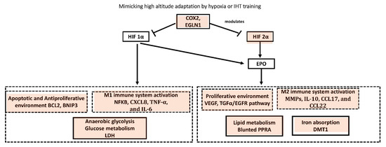 Similarly, adapting to hypoxia in the same way as high-altitude individuals would be beneficial by instigating adaptation of similar critical genes that will help individuals deal with hypoxia and oxygen-related disorders. Intermittent hypoxic exposure with exercise training, for example, implies that a brief exposure to hypoxia is adequate to produce HIF-mediated positive muscle adaptations. According to previous studies, leukocytes respond to hypoxia with significant inter-individual variation in HIF-1α mRNA [75]. HIF-1α and HIF-2α mRNA levels are transiently elevated in untrained human skeletal muscle in response to an acute exercise bout, but this reaction is attenuated after exercise training, according to the researchers. They hypothesized that exercise increases HIFs expression, and that it could be a key transcription factor in regulating adaptive gene responses to exercise [76]. According to a narrative review published in 2017, research showed either an increase or no change in hematological variables following altitude training, with factors such as hypoxic dose, training content, athletes’ training background, and/or individual variability of EPO production [77]. Another study looked at the effects of IHT on anaerobic and aerobic capacity as well as swimming performance in well-trained swimmers (n = 16). After high-intensity IHT, they found that anaerobic capacity and swimming performance improved significantly. The training program, however, had no effect on absolute VO2max or hematological variables [78]. Another study looked at the impact of hypoxic training on metabolic alterations, notably liver metabolism, in obese mice fed a high-fat diet (HFD). Insulin levels improved after hypoxic training, according to their findings. Furthermore, liver metabolomics revealed information about hypoxia training’s protective effect against HFD-induced fatty liver [79]. Another study investigated the acute inflammatory response to a hypoxia-induced repeat sprint training session. On separate days, 11 amateur team-sport athletes performed a repeat-sprint training (RSH) program (4 sets of sprints) under normoxia and normobaric hypoxic conditions (percentage of inspired oxygen 0.145 to imitate an altitude of 3000 m). When compared to the identical training session performed in normoxia, their findings showed that team-sport athletes can perform an RSH session without increasing inflammation [80]. Another fascinating study looked at the impact of combining yoga with high vitamin D supplementation on the expression and systemic levels of inflammatory cytokines, as well as the psychophysical status of breast cancer survivors [81]. According to their findings, yoga improves physical and psychological fitness and, when combined with a high dose of vitamin D, improves cytokine profiles, which can help manage cancer-related side effects. Another study (n = 54) looked at the impact of a resistance exercise program in the presence of intermittent hypoxia on inflammatory biomarkers in seniors. The subjects were randomly assigned to one of three groups: control, resistance training normoxia, and resistance training hypoxia (RTH). The subjects trained under hypoxic conditions at a simulated altitude of 2500 m for 24 weeks. The training program was similar in both experimental groups. Resistance training, whether done in normoxia or hypoxia, was found to be effective in reducing chronic inflammation associated with aging [82]. Another study looked at how endothelial shedding [circulating endothelial cells (ECs)] and hematopoietic stem and progenitor cells (CPCs) changed when 11 healthy unacclimatized participants were exposed to high altitude, after intense exercise, and following an overnight stay in hypobaric hypoxia. MMP activity did not vary throughout the investigation, according to the researchers. MMP-9 concentrations in the blood were linked to EC concentrations, but not MMP activity. Their findings helped researchers learn more about the endothelium and an immature immune system during an active, short-term stay at high altitude [83,84]. The proposed overlapping mechanism mimicking high altitude population and hypoxia or IHT is outlined in Figure 2.