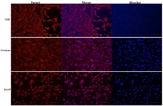 Immunofluorescence analysis of the expression of VIM, Versican and Sox18 in the isolated DPCs. Scale bars, 100 μm. Red fluorescence indicates the nuclear expression pattern of the target protein. The nucleus was stained with blue Hoechst dye.