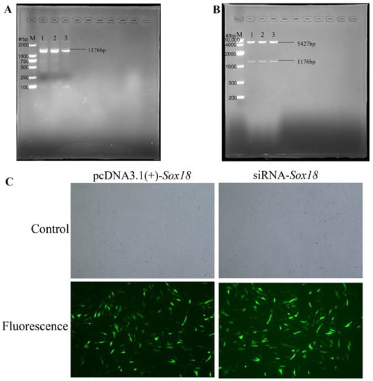 According to the manual of ClonExpress® II One Step Cloning Kit, the recombination reaction was carried out. The recombinant product was then transformed into Trelief™ 5α chemically competent cells (Tsingke, Beijing, China). Individual colonies were selected and placed in tubes with 15 mL of ampicillin-resistant LB broth and shaken for 16 h. The plasmid was extracted from 10 mL of the bacterial solution by using an EndoFree Mini Plasmid Kit Ⅱ (Tsingke, Beijing, China) and was examined by double restriction endonuclease digestion. Finally, the successfully constructed vector was named pcDNA3.1(+)-Sox18 (Figure S1) and stored at −20 °C.