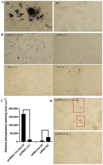 Alkaline phosphatase activity is an important index for evaluating the induction ability of DPCs []. Therefore, we detected the alkaline phosphatase activity of DPCs in Hu sheep by staining, and an increased number of staining sites and a darker color indicated stronger alkaline phosphatase activity. Firstly, we detected the alkaline phosphatase activity of primary DPCs. The results showed that primary DPCs had strong alkaline phosphatase activity (Figure 3A). We then stained the third-generation DPCs and found that the alkaline phosphatase activity of the third-generation DPCs became weak (Figure 3A). Finally, we transfected pcDNA3.1(+)-Sox18, pcDNA3.1(+), siRNA-Sox18 and siRNA-NC separately in the third-generation DPCs, and detected alkaline phosphatase activity in the DPCs 24 h after transfection. The results showed that overexpression of Sox18 significantly enhanced the alkaline phosphatase activity of DPCs, and interfering with Sox18 decreased the alkaline phosphatase activity of DPCs (Figure 3B,C). Further observations showed that the overexpression of Sox18 could promote the agglutination of DPCs (Figure 3D). These results showed that Sox18 enhanced the induction ability of DPCs.